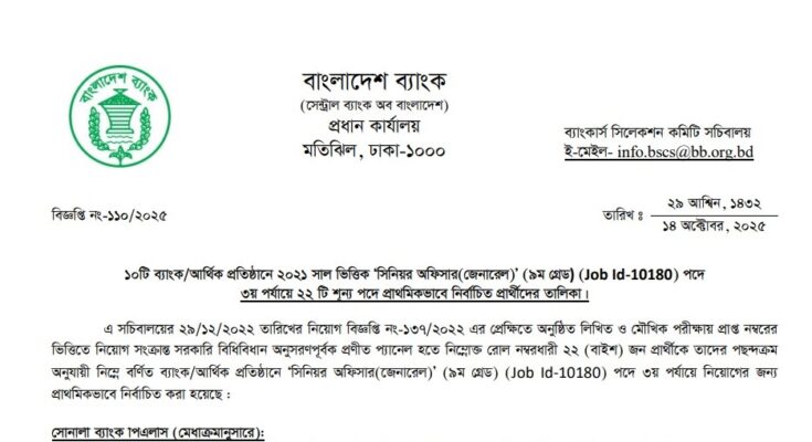 The Combined 10 Bank Senior Officer 3rd Phase Panel Result 2025 has been published. 10 Combined Bank Senior Officer 3rd Phase Panel Result 2025 has been published by the authority. The Combined 10 Bank Senior Officer (General) 3rd Phase Panel Result 2025 is good news for job seekers in Bangladesh. All information on the Combined 10 Bank SO 3rd Phase Panel Result 2025 is available below. The Banker’s Selection Committee Secretariat (BSCS) is a Government Organization in Bangladesh.