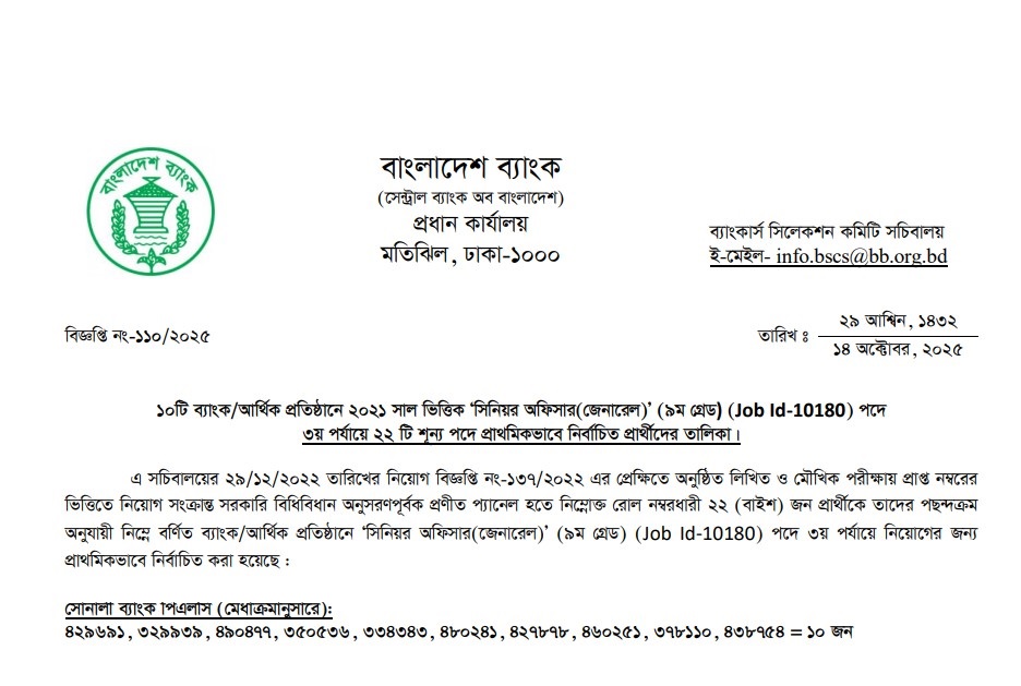 Combined 10 Bank Senior Officer (General) 3rd Panel Result Notice 2025 has been published. Bangladesh Bank is the central bank of Bangladesh. Bangladesh Bank has published a huge job circular by the Authority. All information regarding the appointment at Bangladesh Bank is given on our website, jobstestbd.com. We publish all job circulars every day, Such as Government Jobs in Bangladesh, Bank Jobs in Bangladesh, Private Jobs in Bangladesh, International NGOs in Bangladesh, Private companies in Bangladesh, and Private University Jobs in Bangladesh. Bank Jobs Results, Government Jobs Results, Government University Jobs Results in Bangladesh, and all Part-time Jobs in Bangladesh and other educational support are available here on our website. We provide different types of job information, with also provide some effective information or resources and job tips which help to get a job easily. We trust that our distributed data helps job seekers who are looking for better employment. We likewise share slanting assets for learners who are expanding their insight. Our prime target turns into a trustworthy occupation round site in Bangladesh by distributing a genuine update that provides opportunities to individuals. All the jobs on this website are not only for unemployed people but also for employed people. All types of suggestions and question solutions for the different competitive exams are available here. We provide all types of educational support on our website, jobstestbd.com. So every day, tune in to our website for all kinds of educational support. Please like our Facebook page, jobstestbd.com.