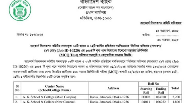 The Combined 11 Bank Senior Officer MCQ Exam Seat Plan 2025 has been published. The authority has published the Combined Bank Senior Officer Exam Seat Plan 2025. The Combined 11 Bank Senior Officer (General) MCQ Exam Seat Plan 2025 is good news for job seekers in Bangladesh. All information on the 11 Bank Senior Officer (General) Exam Date 2025 is available below. The Banker’s Selection Committee Secretariat (BSCS) is a Government Organization in Bangladesh.