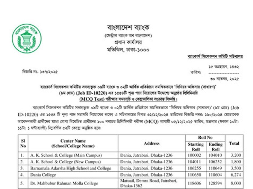 The Combined 11 Bank Senior Officer (General) Exam Date Notice 2025 has been published. Bangladesh Bank is the central bank of Bangladesh. Bangladesh Bank has published a huge job circular by the Authority. All information regarding the appointment at Bangladesh Bank is given on our website, jobstestbd.com. We publish all job circulars daily, Such as Government Jobs in Bangladesh, Bank Jobs in Bangladesh, Private Jobs in Bangladesh, International NGOs in Bangladesh, Private companies in Bangladesh, and Private University Jobs in Bangladesh. Bank Jobs Results, Government Jobs Results, Government University Jobs Results in Bangladesh, and all Part-time Jobs in Bangladesh and other educational support are available here on our website. We provide different types of job information and some effective information or resources, and job tips that help to get a job easily. We trust that our distribution data helps job seekers who are looking for better employment. We likewise share slanting assets for learners who are expanding their insight. Our main target is to establish a trustworthy occupation round site in Bangladesh by distributing a genuine update that enables opportunities for individuals. All the jobs on this website are not only for unemployed people but also for employed people. All types of suggestions and solutions for the different competitive exams are available here. We provide all types of educational support on our website, jobstestbd.com. So every day, tune in to our website for all kinds of academic support. Please like our Facebook page, jobstestbd.com.
