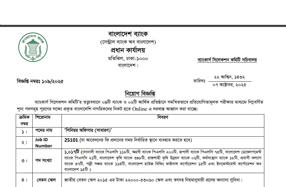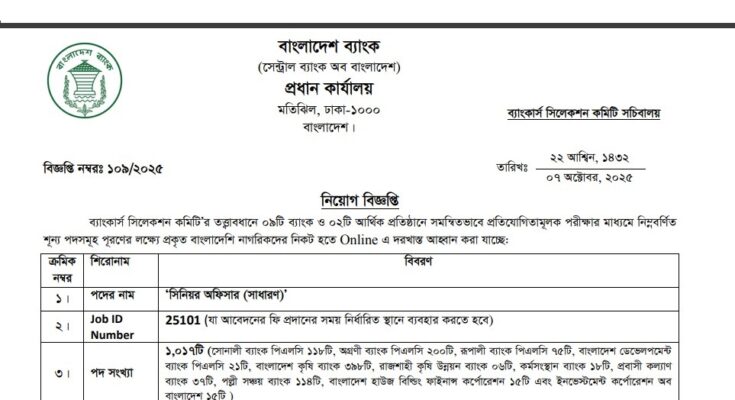 The Combined 11 Bank Senior Officer Job Circular 2025 has been published. 11 Combined Bank Senior Officer Job Circular 2025 has been published by the authority. The Combined Bank Senior Officer Job Circular 2025 is good news for job seekers. All information on the Combined 11 Bank Job Circular 2025 is available below. The Bankers’ Selection Committee Secretariat is a Government organization in Bangladesh.
