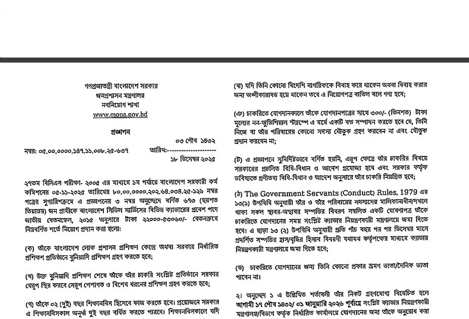 27th BCS Gazette 2025 has been published. The 27th BCS Final Gazette 2025 has been published by the authority. The 27th BCS Gazette Notice 2025 is helpful for job seekers in Bangladesh. All information on the 27th BCS Joining Notice 2025 is available below. Bangladesh Public Service Commission (BPSC) is a Government Organization in Bangladesh.