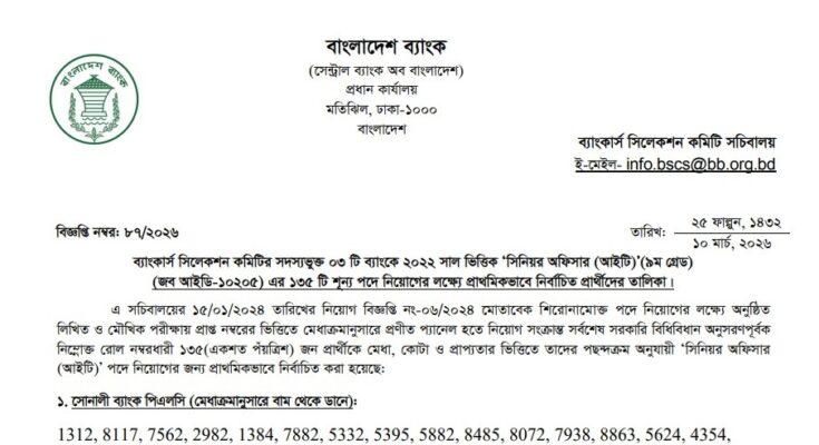 Combined 3 Bank Senior Officer (IT) Final Result 2026 has been published. 3 Combined Bank Senior Officer (IT) Final Result 2026 has been published by the authority. The Combined 3 Bank Senior Officer (IT) Viva Result 2026 is good news for job seekers. All information on the Combined 3 Senior Officer IT Bank Final Result 2026 is available below. The Bankers’ Selection Committee Secretariat is a Government organization in Bangladesh.