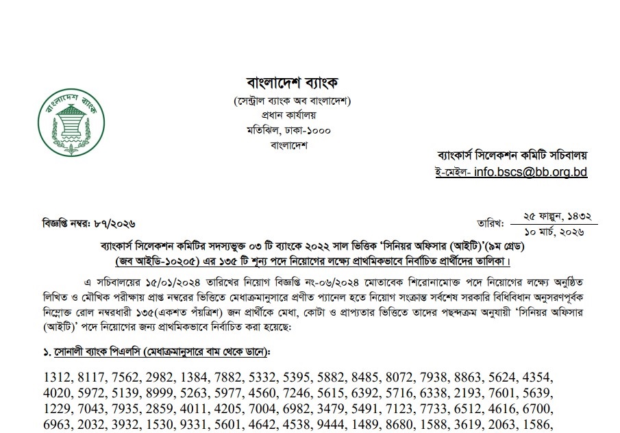 Combined 3 Bank Senior Officer (IT) Final Result 2026 has been published. 3 Combined Bank Senior Officer (IT) Final Result 2026 has been published by the authority. The Combined 3 Bank Senior Officer (IT) Viva Result 2026 is good news for job seekers. All information on the Combined 3 Senior Officer IT Bank Final Result 2026 is available below. The Bankers’ Selection Committee Secretariat is a Government organization in Bangladesh.