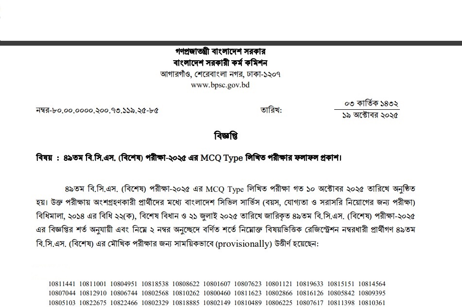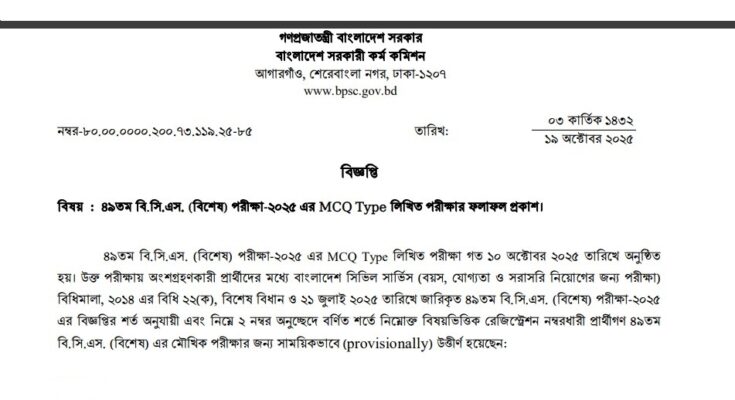49th BCS MCQ Exam Result 2025 has been published. 49 BCS Preliminary Exam Result 2025 has been published by the Bangladesh Public Service Commission (BPSC). The 49th BCS (Special) MCQ Exam Result 2025 is good news for the students in Bangladesh. All information on the BPSC 49th Education BCS MCQ Exam Result 2025 is available below. Bangladesh Public Service Commission (BPSC) is a government organization in Bangladesh.