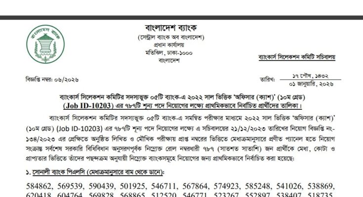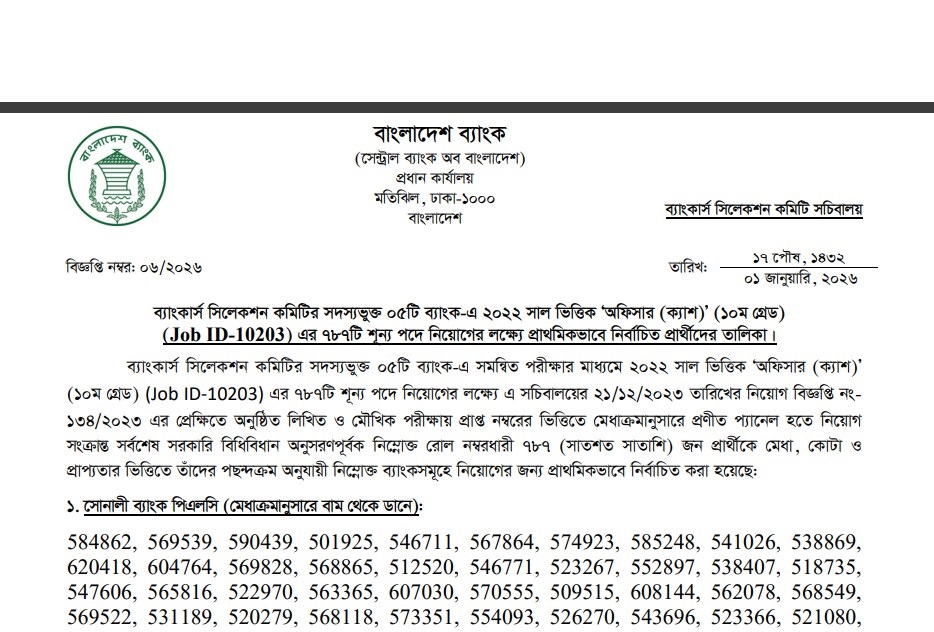 Combined 5 Bank Officer (Cash) Final Viva Result 2026 has been published. The authority has published the 5 Combined Bank Final Result 2026. The 5 Combined Bank Cash Officer Final Result 2026 is great news for job seekers in Bangladesh. All information on the Combined 5 Bank Officer (Teller) Final Result 2026 is available below. Bankers Selection Committee Secretariat (BSCS) is a government organization of the Bangladesh Bank.