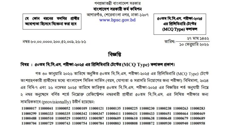 50th BCS MCQ Exam Result 2026 has been published. The 50th BCS Preliminary Exam Result 2026 has been published by the Bangladesh Public Service Commission (BPSC). The 50th BCS (General) MCQ Exam Result 2026 is good news for the students in Bangladesh. All information on the BPSC 50th BCS Preli Exam Result 2026 is available below. Bangladesh Public Service Commission (BPSC) is a government organization in Bangladesh.