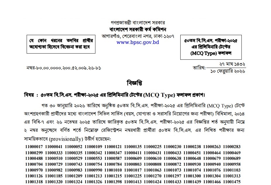 See/download the 50th BCS MCQ Exam Result Notice 2026 from the images below: