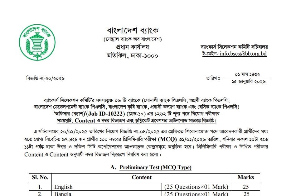 The Combined 6 Bank Officer (Cash) MCQ Exam Date 2026 has been published. 6 Combined Bank Preliminary Exam Date 2026 Notice has been published by the authority. The 6 Combined Bank Cash Officer MCQ Exam Date 2026 is great news for job seekers in Bangladesh. All information on the Combined 6 Bank Officer (Teller) MCQ Exam Date 2026 is available below. Bankers Selection Committee Secretariat (BSCS) is a government organization of the Bangladesh Bank.