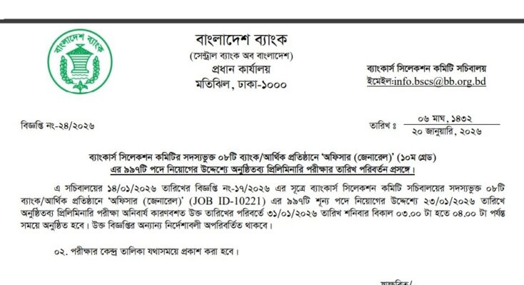 The Combined 8 Bank Officer (General) MCQ Exam Date 2026 has been published. The authority has published the Combined 8 Bank Officer Preli Exam Date 2026. The Combined 8 Bank Officer (General) Exam Syllabus 2026 is good news for job seekers in Bangladesh. All information on the 8 Bank Officer (General) Exam Date 2026 is available below. The Banker’s Selection Committee Secretariat (BSCS) is a Government Organization in Bangladesh.
