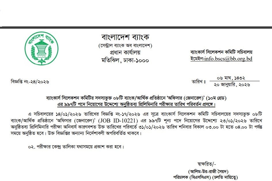 The Combined 8 Bank Officer (General) Exam Notice 2026 has been published. Bangladesh Bank is the central bank of Bangladesh. Bangladesh Bank has published a huge job circular by the Authority. All information regarding the appointment at Bangladesh Bank is given on our website, jobstestbd.com. We publish all job circulars daily, Such as Government Jobs in Bangladesh, Bank Jobs in Bangladesh, Private Jobs in Bangladesh, International NGOs in Bangladesh, Private companies in Bangladesh, and Private University Jobs in Bangladesh. Bank Jobs Results, Government Jobs Results, Government University Jobs Results in Bangladesh, and all Part-time Jobs in Bangladesh and other educational support are available here on our website. We provide different types of job information, some effective information or resources, and job tips that help to get a job easily. We trust that our distribution data helps job seekers who are looking for better employment. We likewise share slanting assets for learners who are expanding their insight. Our main target is to establish a trustworthy occupation round site in Bangladesh by distributing a genuine refresh that enables opportunities to individuals. All the jobs on this website are not only for unemployed people but also for employed people. All types of suggestions and solutions for the different competitive exams are available here. We provide all types of educational support on our website, jobstestbd.com. So every day, tune in to our website for all kinds of academic support. Please like our Facebook page, jobstestbd.com.