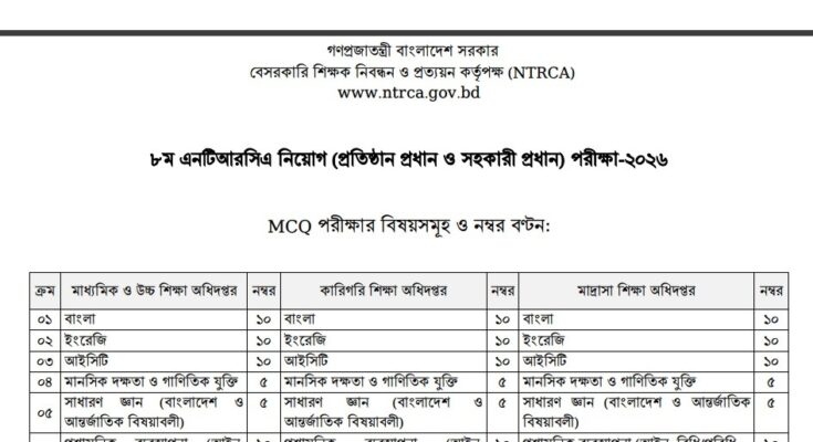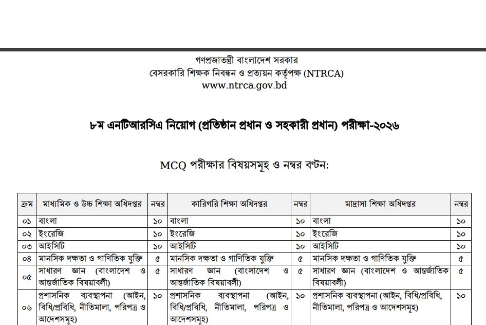 The NTRCA Organization Head and Assistant Head Exam Syllabus and Marks Distribution 2026 have been published. The authority has published the NTRCA Head Master Exam Syllabus and Marks Distribution 2026. Non-Government Teachers Registration and Certification Authority (NTRCA) Organization Head Exam Syllabus 2026 is good news for job seekers. All information on the NTRCA Assistant Head Master Exam Syllabus 2026 is available below. The Non-Government Teachers Registration and Certification Authority (NTRCA) is a government organization in Bangladesh.