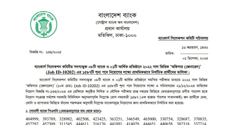 Combined 9 Bank Officer (General) Final Result 2025 has been published. The authority has published the 9 Bank Officer (General) Final Result 2025. The Combined 9 Bank Officer (General) Viva Result 2025 is good news for job seekers in Bangladesh. All information on the Combined 9 Bank Officer Final Viva Result 2025 is available below. The Banker’s Selection Committee Secretariat (BSCS) is a Government Organization in Bangladesh.