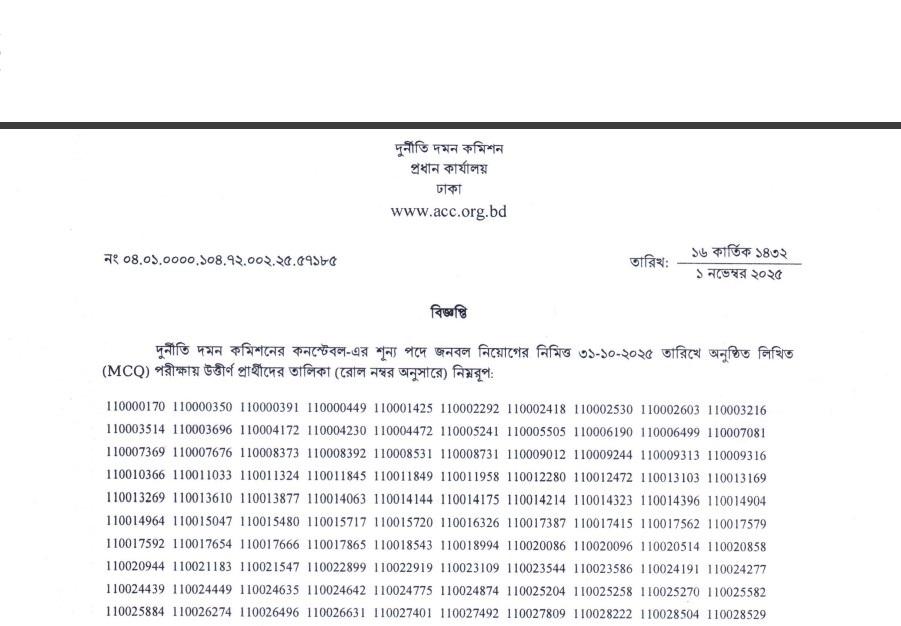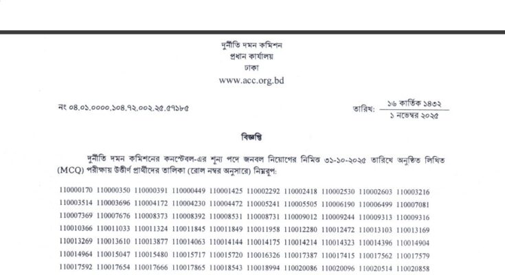 Anti-Corruption Commission (ACC) Constable Exam Result 2025 has been published. Anti-Corruption Commission Exam Result 2025 has been published by the authority. Dudok Constable Exam Result 2025 is good news for job seekers in Bangladesh. All information about the Anti-Corruption Commission Constable Exam Result 2025 is available below. The Anti-Corruption Commission (ACC) is a government organization in Bangladesh.