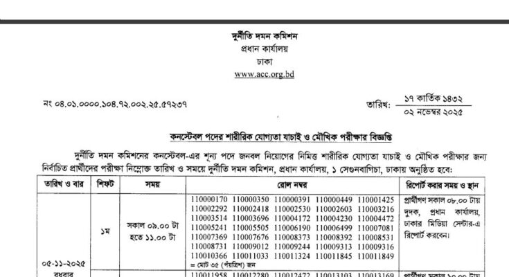 Anti-Corruption Commission (ACC) Constable Physical Fitness and Viva Date 2025 has been published. Anti-Corruption Commission Constable Physical Fitness and Viva Date 2025 has been published by the authority. Dudok Constable Constable Physical Fitness and Viva Date 2025 is good news for job seekers in Bangladesh. All information about the Anti-Corruption Commission Constable Viva Date 2025 is available below. The Anti-Corruption Commission (ACC) is a government organization in Bangladesh.