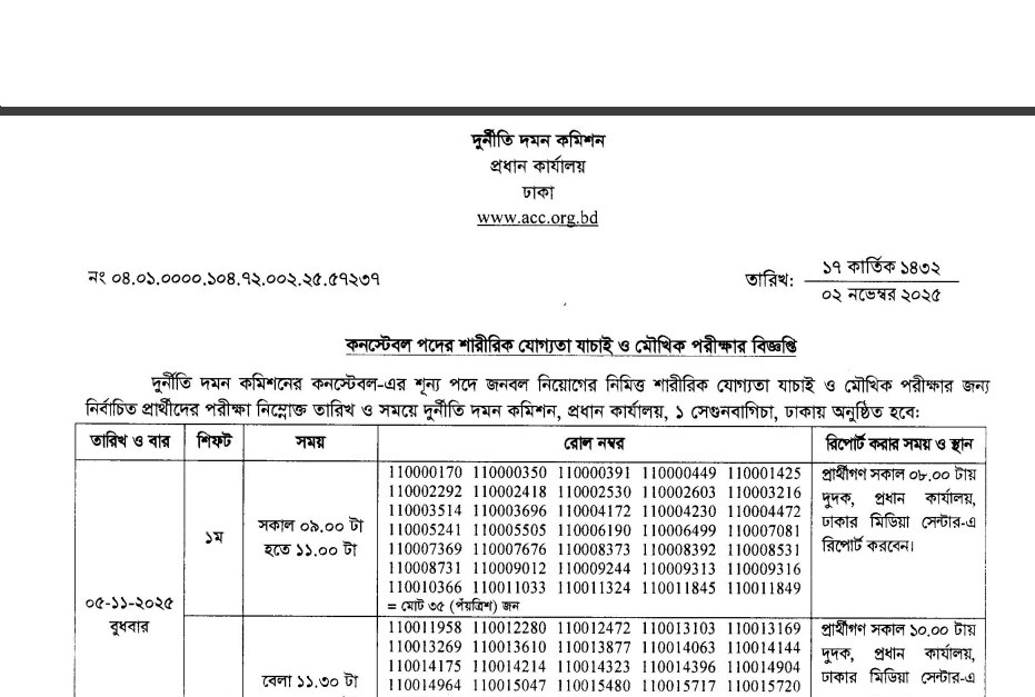 Anti-Corruption Commission (ACC) Constable Physical Fitness and Viva Date 2025 has been published. Anti-Corruption Commission Constable Physical Fitness and Viva Date 2025 has been published by the authority. Dudok Constable Constable Physical Fitness and Viva Date 2025 is good news for job seekers in Bangladesh. All information about the Anti-Corruption Commission Constable Viva Date 2025 is available below. The Anti-Corruption Commission (ACC) is a government organization in Bangladesh.