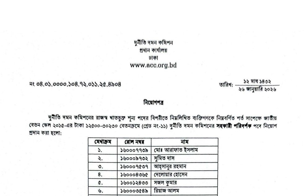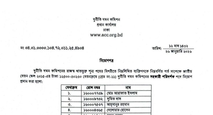 Anti-Corruption Commission (ACC) Job Appointment Letter 2026 has been published. Anti-Corruption Commission Job Appointment Letter 2026 has been published by the authority. Dudok Job Appointment Letter 2026 is good news for job seekers in Bangladesh. All information about the Anti-Corruption Commission Joining Date 2026 is available below. The Anti-Corruption Commission (ACC) is a government organization in Bangladesh.