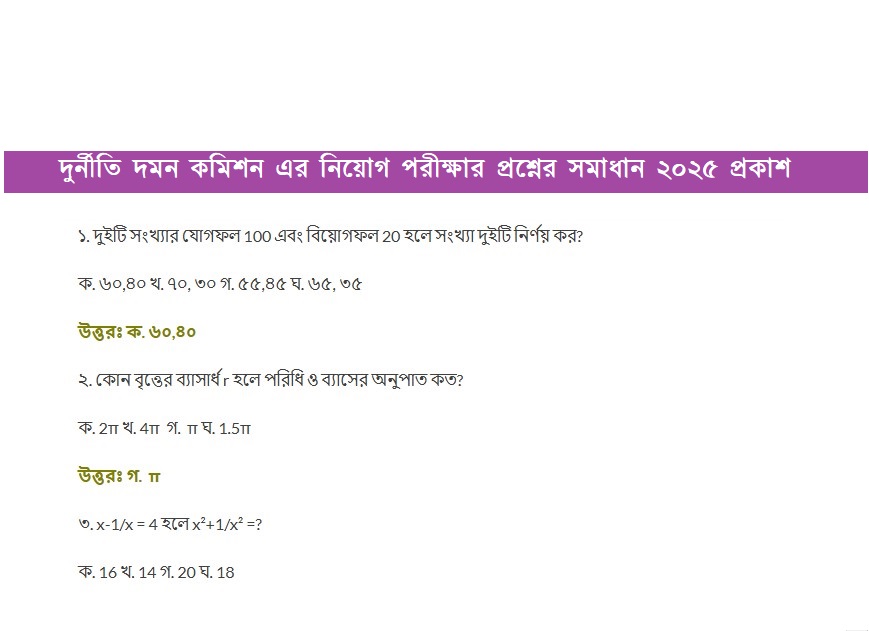 Anti-Corruption Commission (ACC) Office Sohayok Exam Question Solution 2025 has been published. Anti-Corruption Commission (ACC) Exam Question Solution 2025 has been solved by our educational team. ACC MCQ Exam Question Solution 2025 is good news for job seekers in Bangladesh. All information on the Anti-Corruption Commission Office Support Staff Exam Question Solution 2025 is available below. The Anti-Corruption Commission (ACC) is a renowned Government institution in Bangladesh.