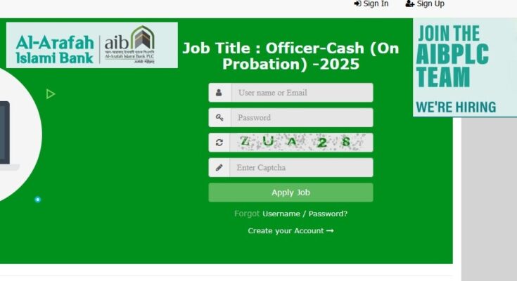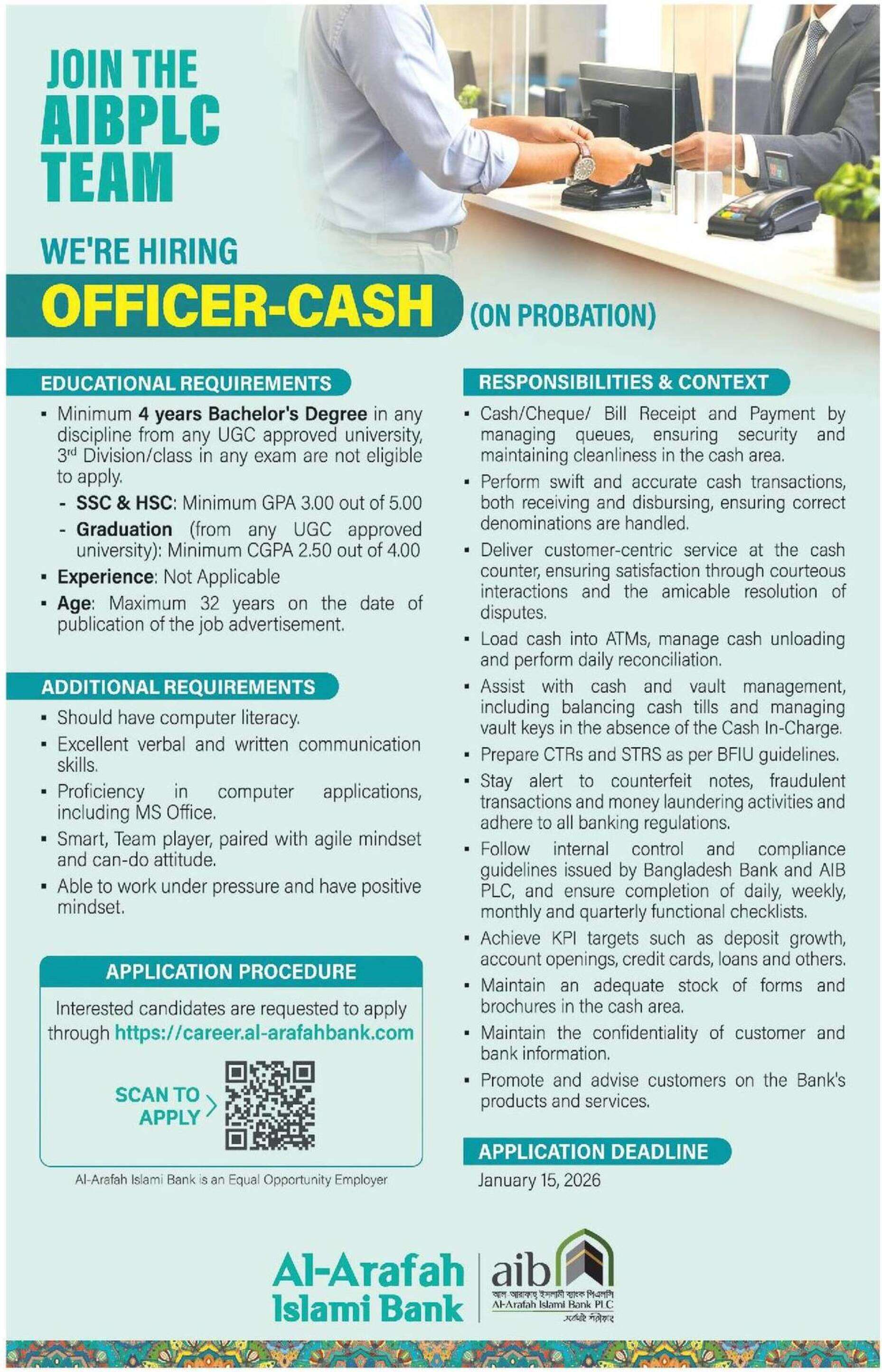 Al-Arafah Islami Bank PLC Officer (Cash) Job Circular 2025 has been published. The authority has published the AIBL Job Circular 2025. Al-Arafah Islami Bank Officer-Cash (On Probation) Job Circular 2025 is good news for job seekers in Bangladesh. All information on the Al-Arafah Islami Bank PLC Job Circular 2025 is available below. Al-Arafah Islami Bank PLC is a Private Bank in Bangladesh.