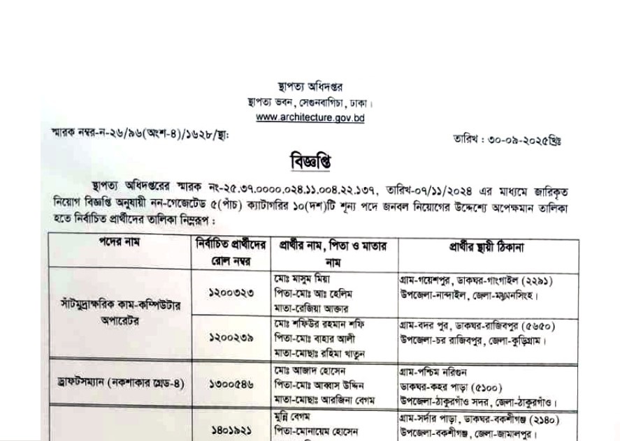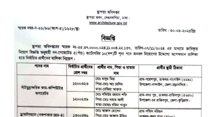 Department of Architecture Panel Result 2025 has been published. The Architecture Department Panel Result 2025 has been published by the authority. Department of Architecture Office Sohayok Panel Result 2025 is good news for job seekers. All information on the Department of Architecture Office Assistant Cum Computer Typist Panel Result 2025 is available below. The Department of Architecture is a government organization in Bangladesh.