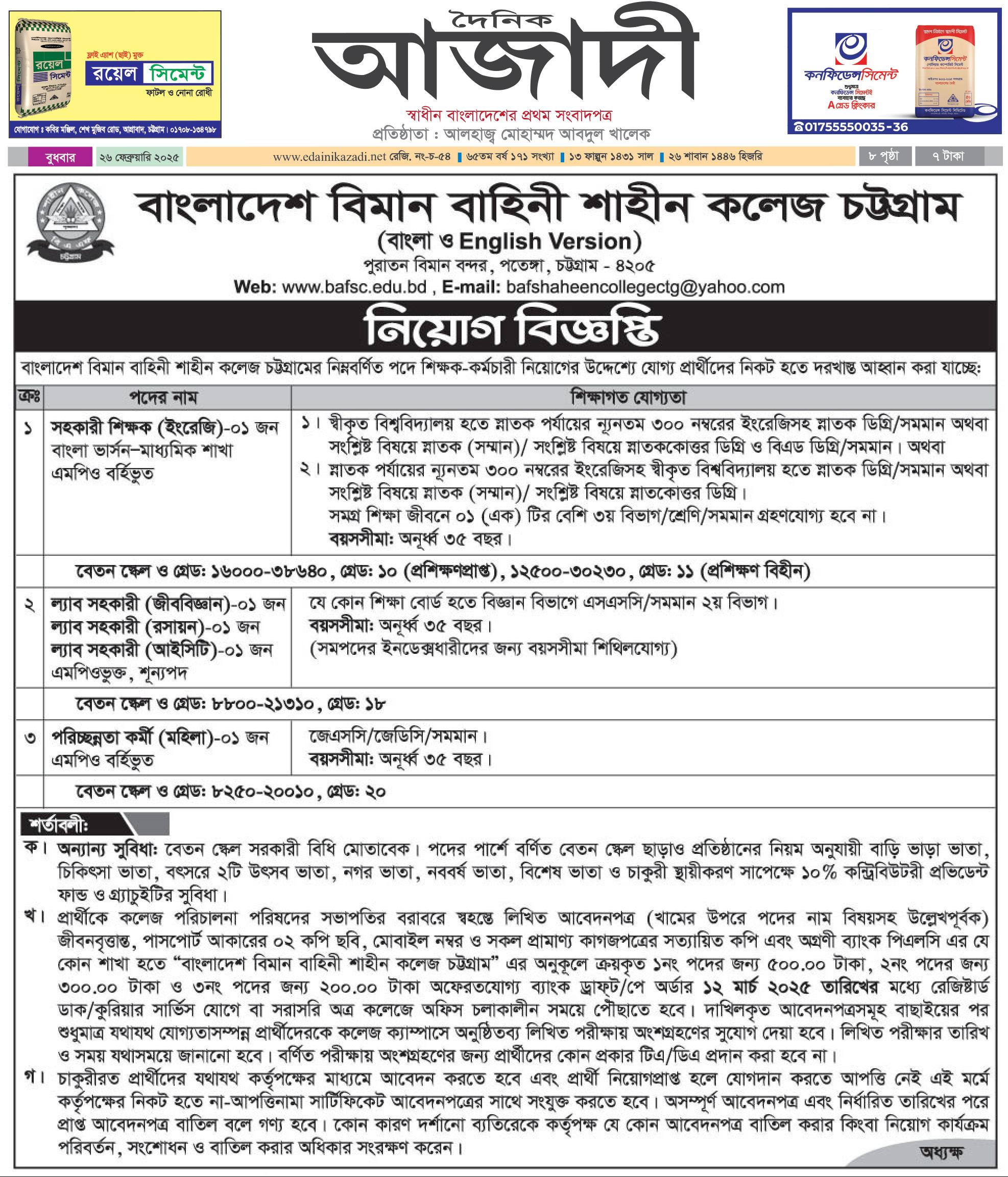 BAF Shaheen College Chattogram Job Circular 2025: