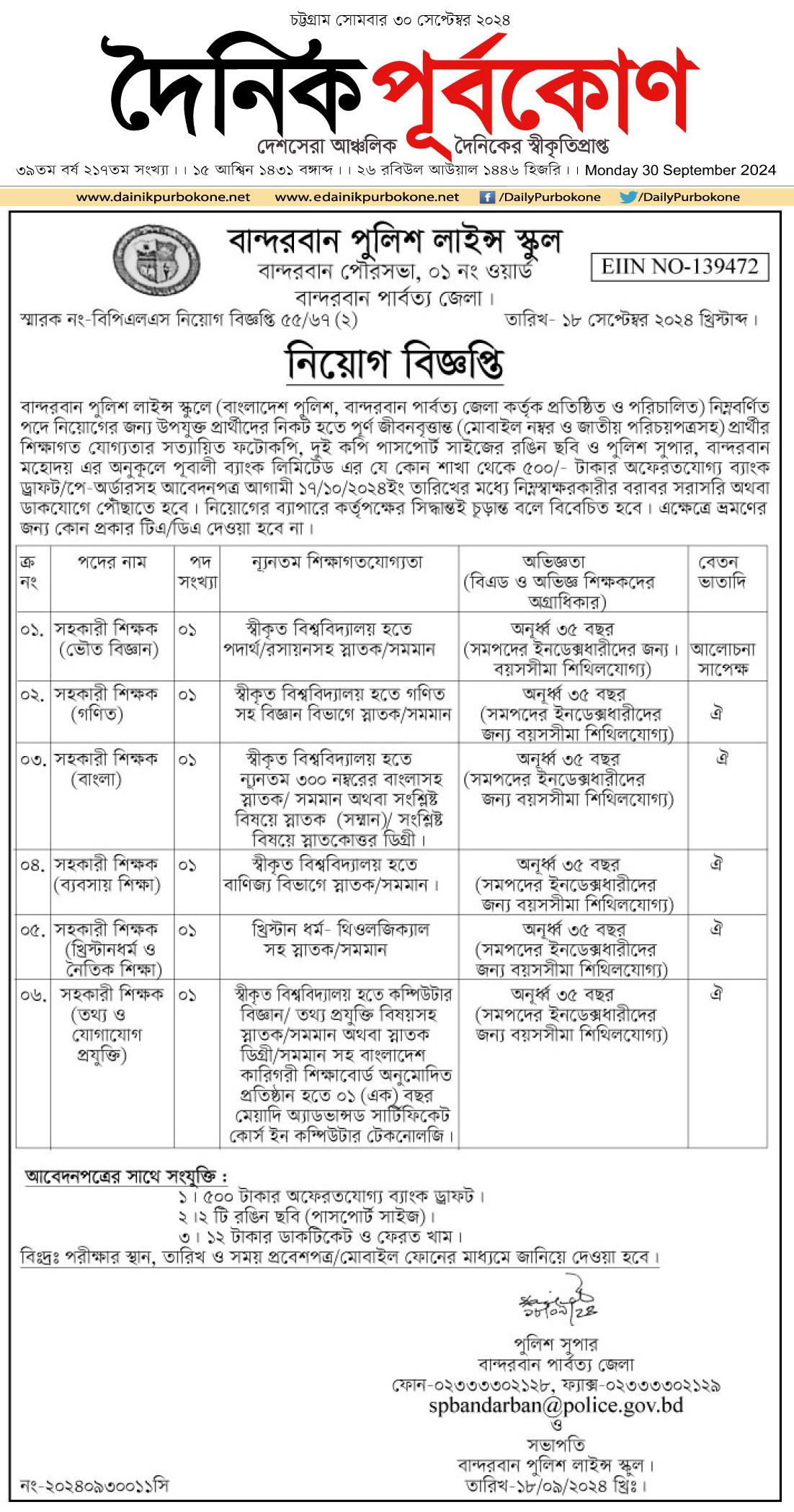 See/download Bandarban Police Lines School Job Circular 2024, Job Apply Instructions, Job Application Form, Application Fee, Payment Process, Salary, Age, and Other Information from the image below: