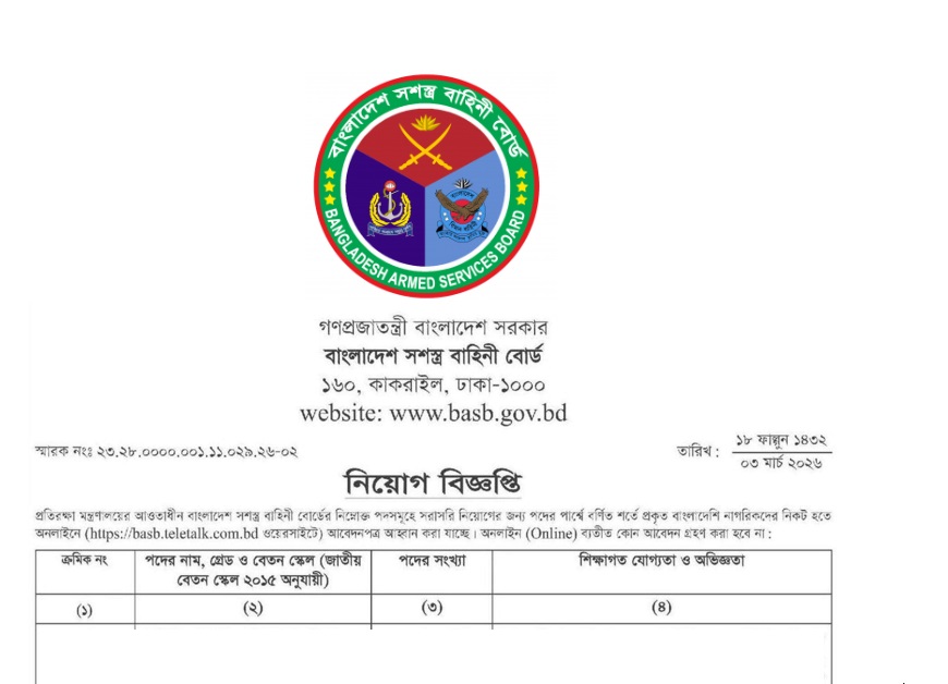 Bangladesh Armed Services Board (BASB) Job Circular 2026 has been published. The authority has published the BASB Job Circular 2026. Bangladesh Armed Services Board Job Application Form 2026 is a slight opportunity for inexperienced people. All information on the Bangladesh Armed Services Board Job Circular 2026 is available below. Bangladesh Armed Services Board (BASB) is a Government Organization in Bangladesh.