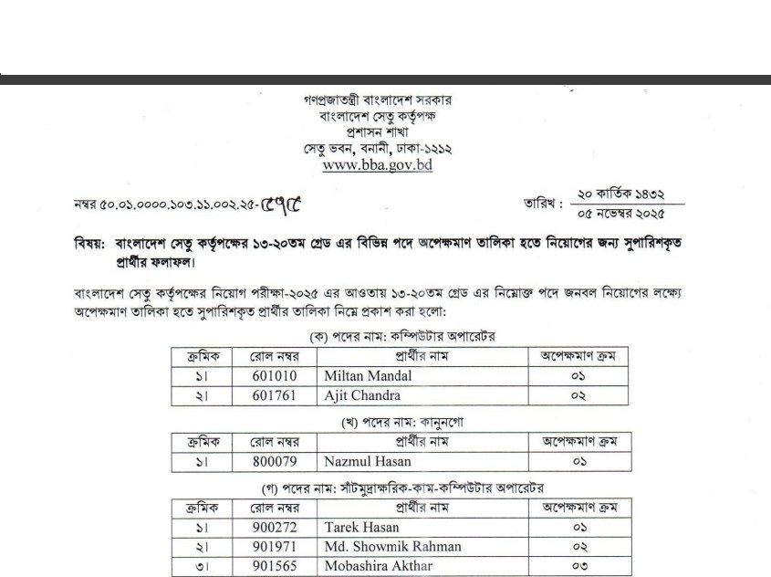 Bangladesh Bridge Authority Exam Result Notice 2025: