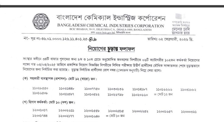 BCIC Final Viva Result 2026 has been published. Bangladesh Chemical Industries Corporation Final Result 2026 has been published by the authority. The BCIC Assistant Administrative Officer Final Result 2026 is good news for job seekers in Bangladesh. All information on the BCIC Assistant Accounts Officer Final Result 2026 is available below. The Bangladesh Chemical Industries Corporation (BCIC) is a Government Organization in Bangladesh.