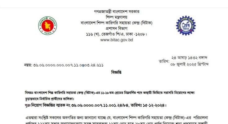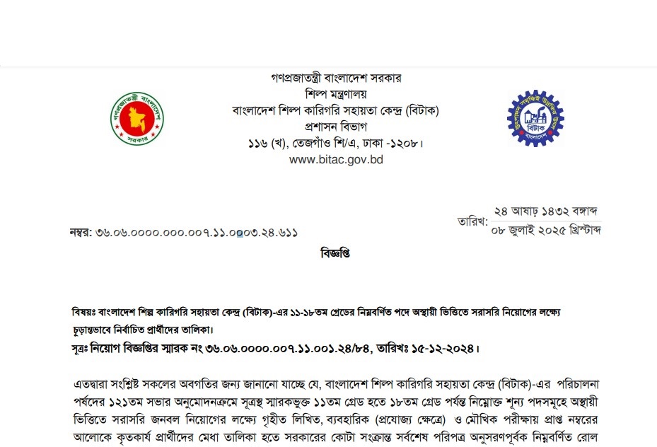 BITAC Job Exam Result Notice 2025 has been published by the authority. Bangladesh Industrial and Technical Assistance Center (BITAC) Job Circular All information is given above. Bangladesh Industrial and Technical Assistance Center (BITAC) is one of the largest Government organizations in Bangladesh. Bangladesh Industrial and Technical Assistance Center (BITAC) has published a huge job circular by the Authority. All information regarding the appointment of the Bangladesh Industrial and Technical Assistance Center (BITAC) is given on our website jobstestbd.com. We Publish all job circulars daily, Such as Government Jobs in Bangladesh, Bank Jobs in Bangladesh, Private Jobs in Bangladesh, International NGOs in Bangladesh, Private companies in Bangladesh, and Private University Jobs in Bangladesh. Bank Jobs Results, Government Jobs Results, Government University Jobs Results in Bangladesh, and all Part-time Jobs in Bangladesh and other educational support are available here on our website. We provide different types of job information with also provide some effective information or resources and job tips which help to get a job easily. We trust that our distributing data helps the activity searchers who are looking for better employment. We likewise share slanting assets for learners who are expanding their insight. Our principle target turns into a trusty occupations round site in Bangladesh by distributing a genuine refresh that enables the opportunities to individuals. All the jobs on this website are not only for unemployed people but also for employed people. All types of suggestions and question solutions for the different competitive exams are available here. We provide all types of educational support on our website jobstestbd.com. So every day visit our website for all kinds of educational support. Please like our Facebook page jobstestbd.com.