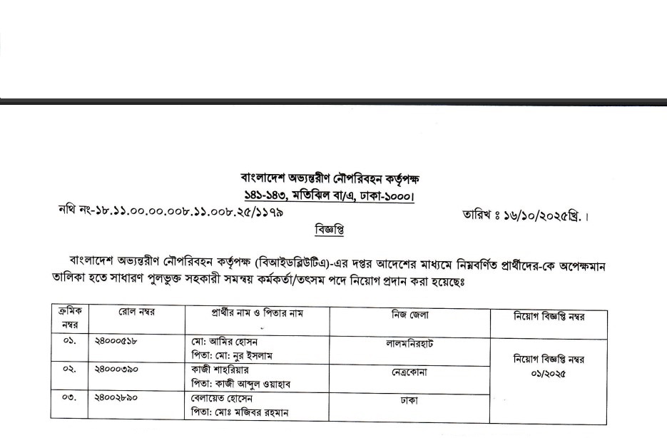 See/download the Bangladesh Inland Water Transport Authority (BIWTA) Panel Result Notice 2025 from the images below: