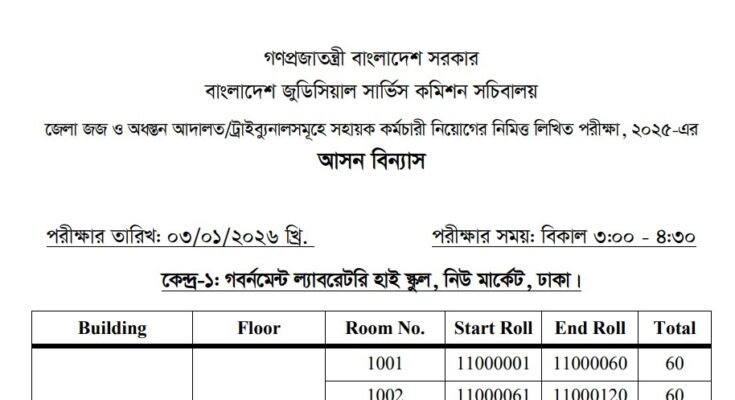 See/download the Bangladesh Judicial Service Commission Secretariat Exam Date, Exam Seat Plan, and Admit Download Notice 2025 from the images below: