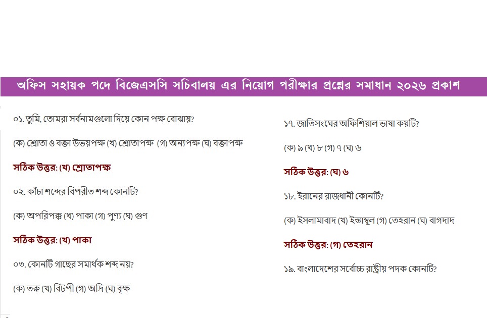 BJSCCR Office Sohayok Exam Question Solution 2026 has been published. Our educational team has solved the BJSC Secretariat Exam Question Solution 2026. Bangladesh Judicial Service Commission Secretariat Exam Question Solution 2026 is good news for job seekers in Bangladesh. All information on the BJSCCR Office Sohayok MCQ Exam Question Solution 2026 is available below. The Bangladesh Judicial Service Commission Secretariat is a renowned Government institution in Bangladesh.