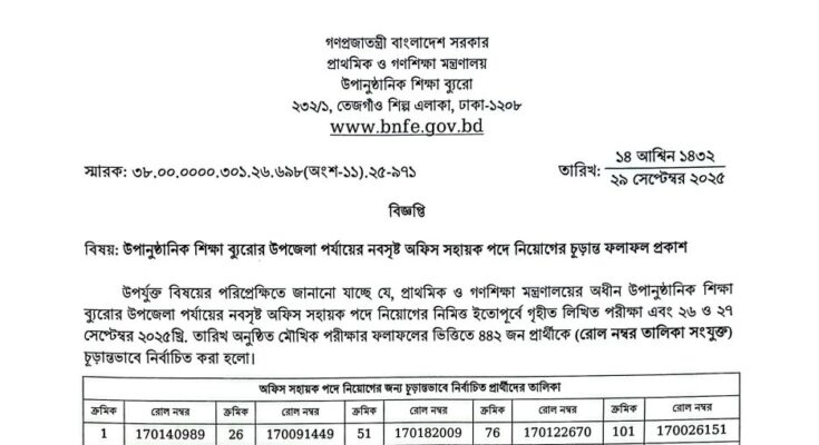 BNFE Final Result 2025 has been published. The authority has published the Bureau of Non-Formal Education (BNFE) Final Result 2025. BNFE Office Assistant Cum Computer Typist Final Result 2025 is good news for job seekers. All information on the BNFE Office Sohayok Final Result 2025 is available below. The Bureau of Non-Formal Education (BNFE) is a Government organization in Bangladesh.