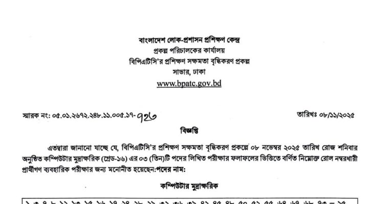BPATC Exam Result 2025 has been published. The authority has published the Bangladesh Public Administration Training Centre (BPATC) Exam Result 2025. BPATC Written Result 2025 is good news for job seekers in Bangladesh. All information on the BPATC Computer Typist Exam Result 2025 is available below. Bangladesh Public Administration Training Centre (BPATC) is a government organization in Bangladesh.