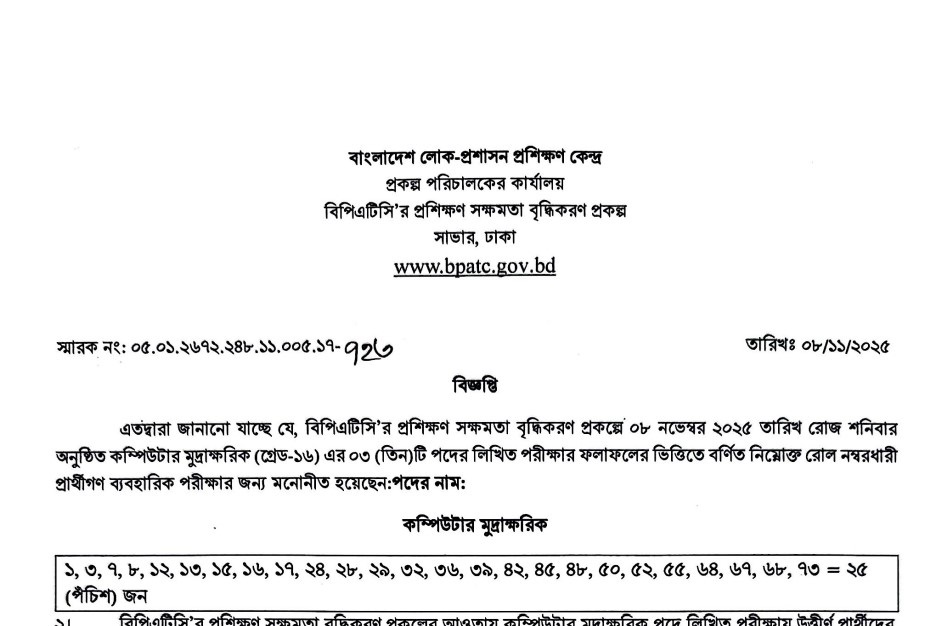 See/download the Bangladesh Public Administration Training Centre (BPATC) Exam Result Notice 2025 from the images below: