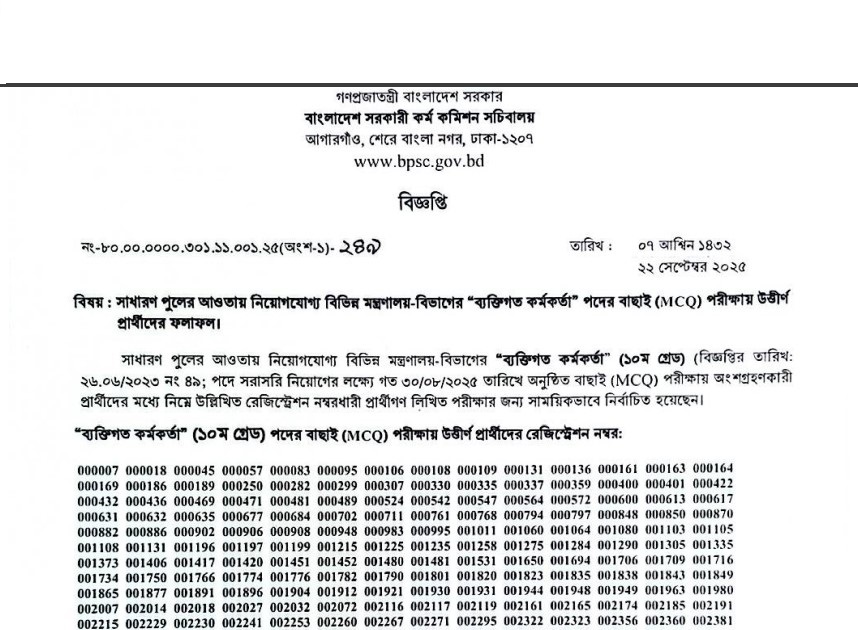 See/download the Bangladesh Public Service Commission Non-Cadre Personal Officer Exam Result Notice 2025 from the images below: