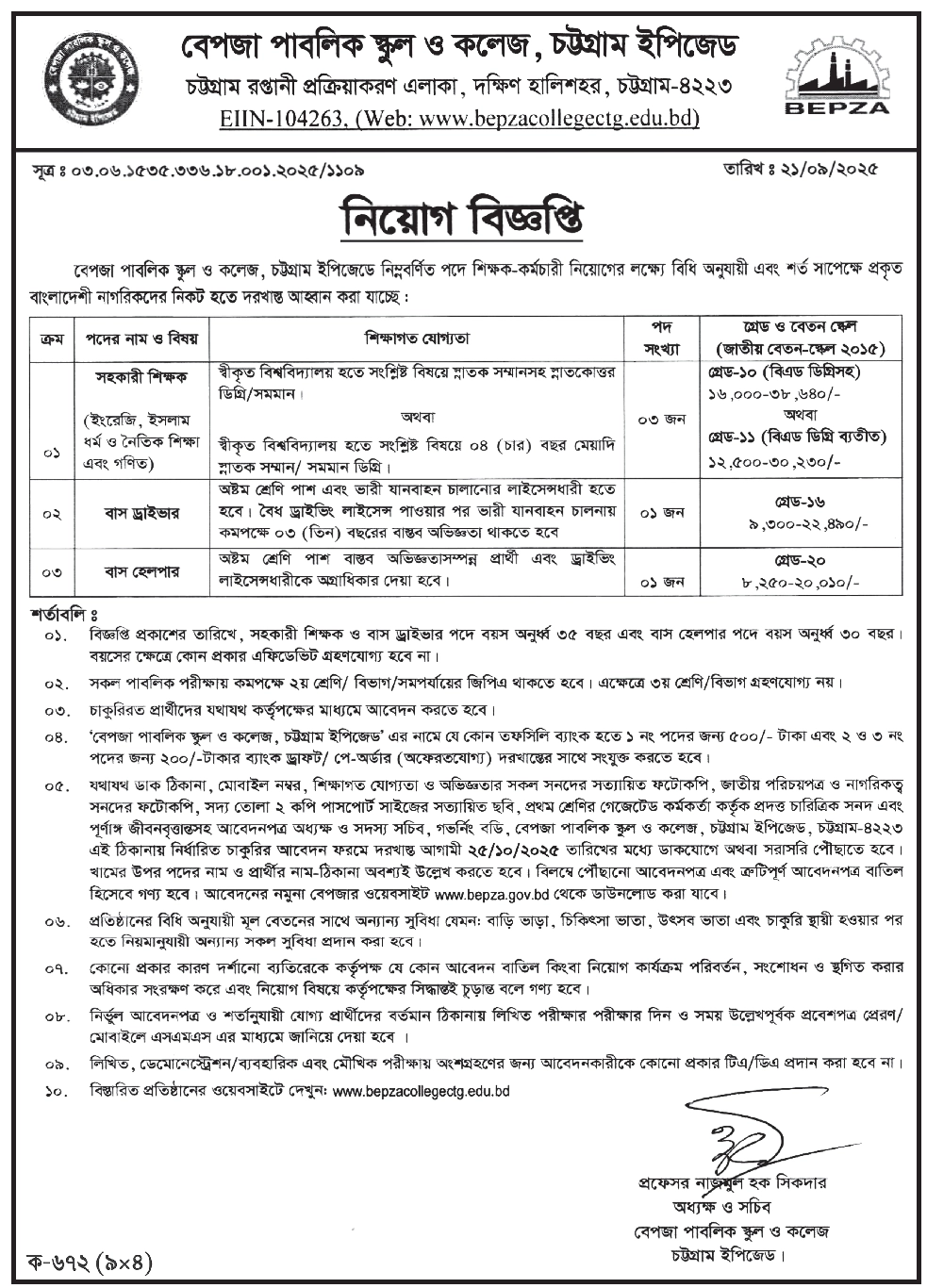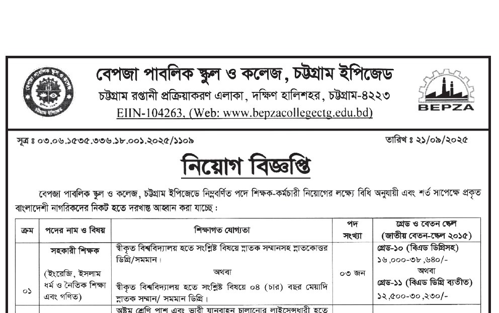See/download the BEPZA Public School and College Chittagong Job Circular 2025, Job Application Form, Job Apply Instructions, Application Fee, Payment Process, Salary, Age, and Other Information from the images below: