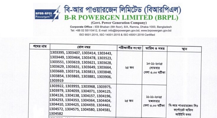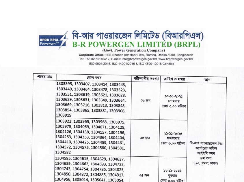 B-R Powergen Limited (BRPL) Exam Result 2025 has been published. BR Powergen Limited Exam Result 2025 has been published by the authority. The BRPL Exam Result 2025 is good news for job seekers in Bangladesh. All information on the B-R Powergen Limited Written Result 2025 is available below. The B-R Powergen Limited (BRPL) is a Government Organization in Bangladesh.