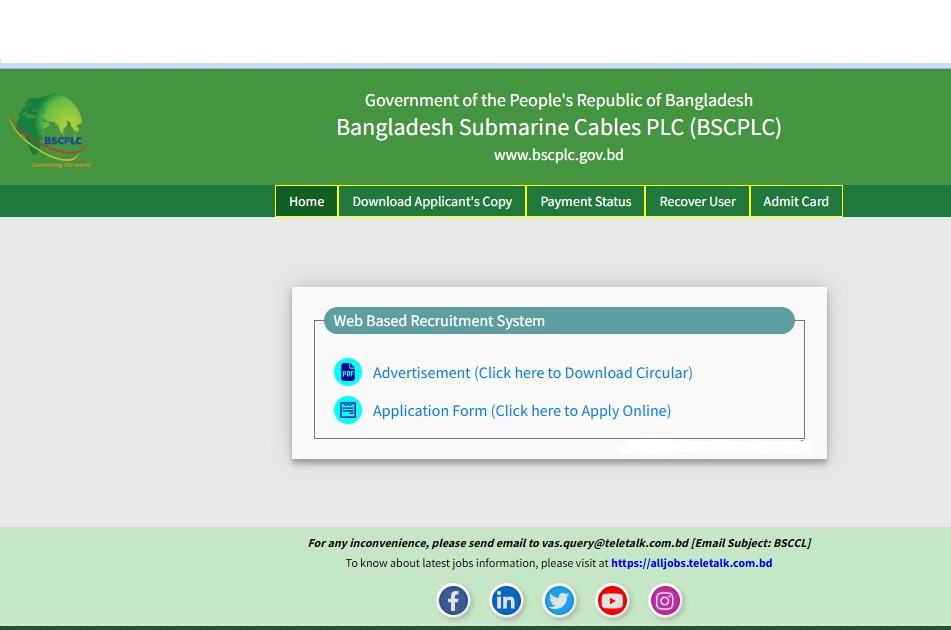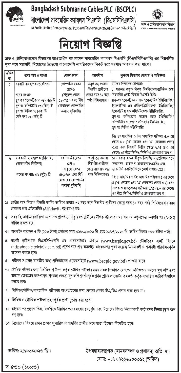 Bangladesh Submarine Cables Job Circular 2026 is available above. Bangladesh Submarine Cables PLC (BSCPLC) has published a Job Circular for the authority. Bangladesh Submarine Cables PLC (BSCPLC) is one of the largest Government organizations in Bangladesh. Bangladesh Submarine Cables PLC (BSCPLC) has published a huge job circular. All information regarding the appointment of the Bangladesh Submarine Cables PLC (BSCPLC) is given on our website, jobstestbd.com. We publish all job circulars daily, including government jobs in Bangladesh, Bank Jobs in Bangladesh, Private Jobs in Bangladesh, International NGOs in Bangladesh, Private companies in Bangladesh, and Private University Jobs in Bangladesh. Bank Jobs Results, Government Jobs Results, Government University Jobs Results in Bangladesh, and all Part-time Jobs in Bangladesh and other educational support are available here on our website. We provide different types of job information, and also provide some effective information or resources and job tips that help to get a job easily. We believe that our distribution of data helps job seekers find better employment opportunities. We likewise share slanting assets for learners who are expanding their insight. Our prime target turns into a trusty occupations round site in Bangladesh by distributing a genuine update that enables opportunities for individuals. All the jobs on this website are not only for unemployed people but also for employed people. All types of suggestions and question solutions for the different competitive exams are available here. We provide all types of educational support on our website, jobstestbd.com. So every day, tune in to our website for all kinds of educational support. Please like our Facebook page, jobstestbd.com.