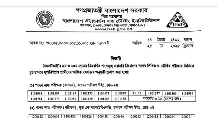 Bangladesh Standards and Testing Institution (BSTI) Exam Result 2025: