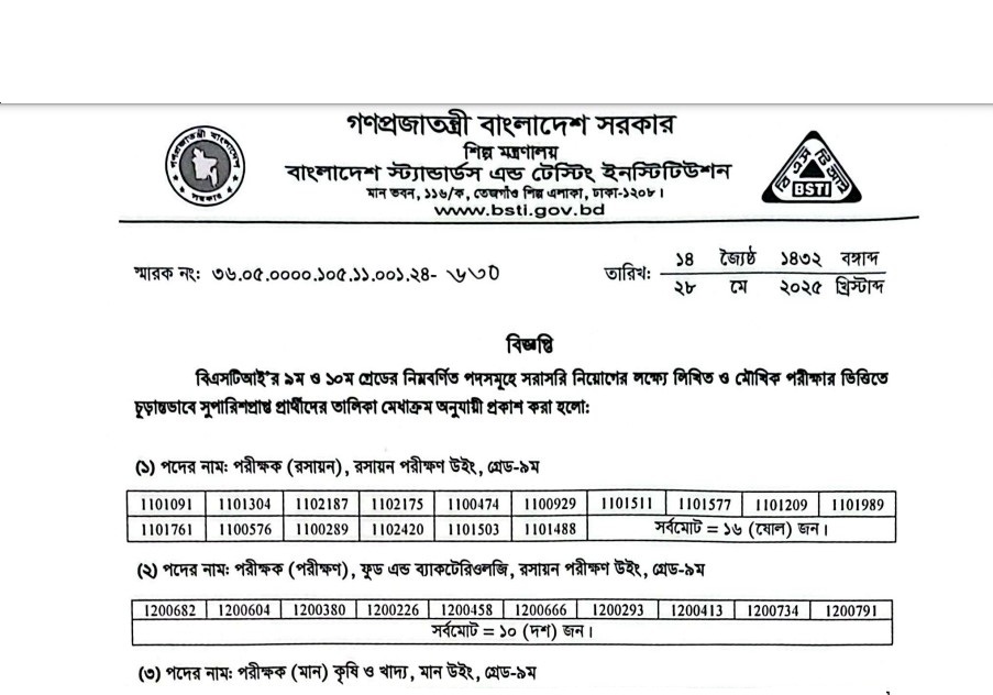 See/download Bangladesh Standards and Testing Institution Exam Result Notice 2025 from the images below: