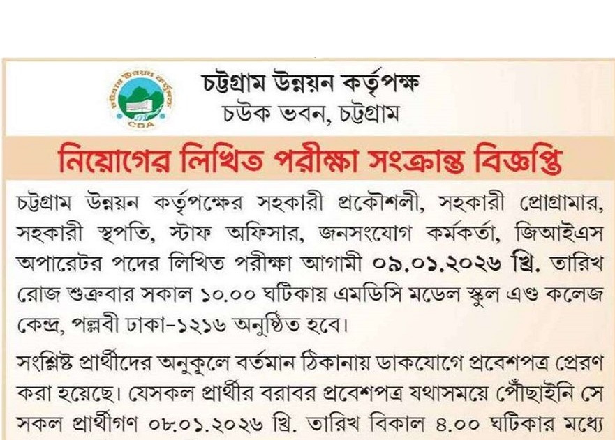 Chattogram Development Authority (CDA) Exam Date 2026 has been published. The authority has published the CDA Exam Date 2026. The Chittagong Development Authority Exam Date 2026 is good news for job seekers in Bangladesh. All information on Chattogram Development Authority Exam Date 2026 is available below. Chattogram Development Authority (CDA) is a Government Organization in Bangladesh.