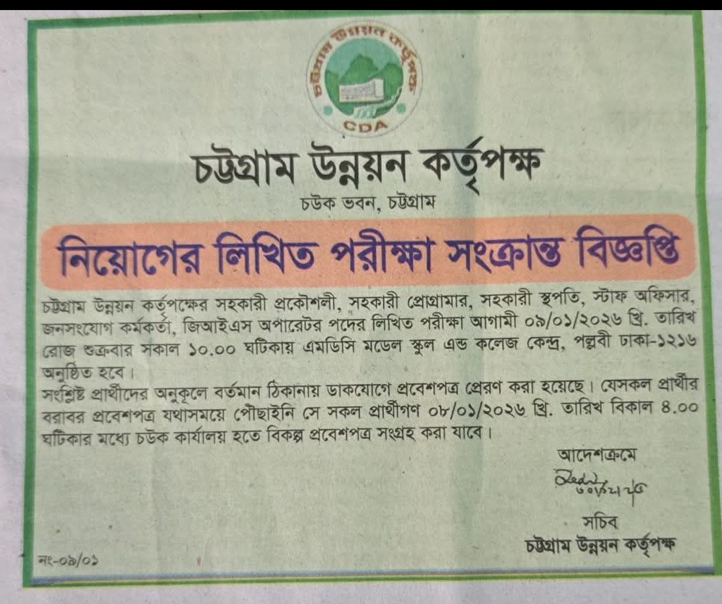 See/download Chattogram Development Authority (CDA) Exam Date Notice 2026 from the image below:
