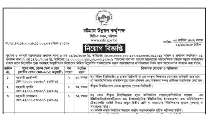 Chattogram Development Authority (CDA) Job Circular 2025 has been published. The authority has published the CDA Job Circular 2025. Chittagong Development Authority Job Circular 2025 is good news for job seekers in Bangladesh. All information on Chattogram Development Authority Job Circular 2025 is available below. Chattogram Development Authority (CDA) is a Government Organization in Bangladesh.