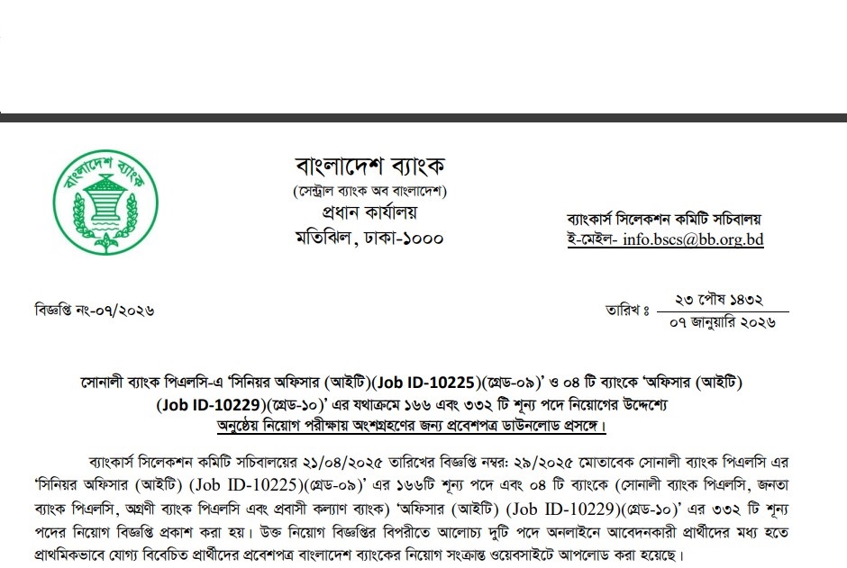The Combined Several Bank IT Post Admit Card Download 2026 has been published. Bangladesh Bank is the central bank of Bangladesh. Bangladesh Bank has published a huge job circular by the Authority. All information regarding the appointment at the Bangladesh Bank is given on our website, jobstestbd.com. We publish all job circulars every day, Such as Government Jobs in Bangladesh, Bank Jobs in Bangladesh, Private Jobs in Bangladesh, International NGOs in Bangladesh, Private companies in Bangladesh, and Private University Jobs in Bangladesh. Bank Jobs Results, Government Jobs Results, Government University Jobs Results in Bangladesh, and all Part-time Jobs in Bangladesh and other educational support are available here on our website. We provide different types of job information, and also provide some effective information or resources and job tips that help to get a job easily. We trust that our distribution data helps job seekers who are finding superior employment. We likewise share slanting assets for learners who are expanding their insight. Our prime target turns into a trustworthy occupation round site in Bangladesh by distributing a genuine update that enables individuals. All the jobs on this website are not only for unemployed people but also for employed people. All types of suggestions and question solutions for the different competitive exams are available here. We provide all types of educational support on our website, jobstestbd.com. So every day, tune in to our website for all kinds of educational support. Please like our Facebook page, jobstestbd.com.