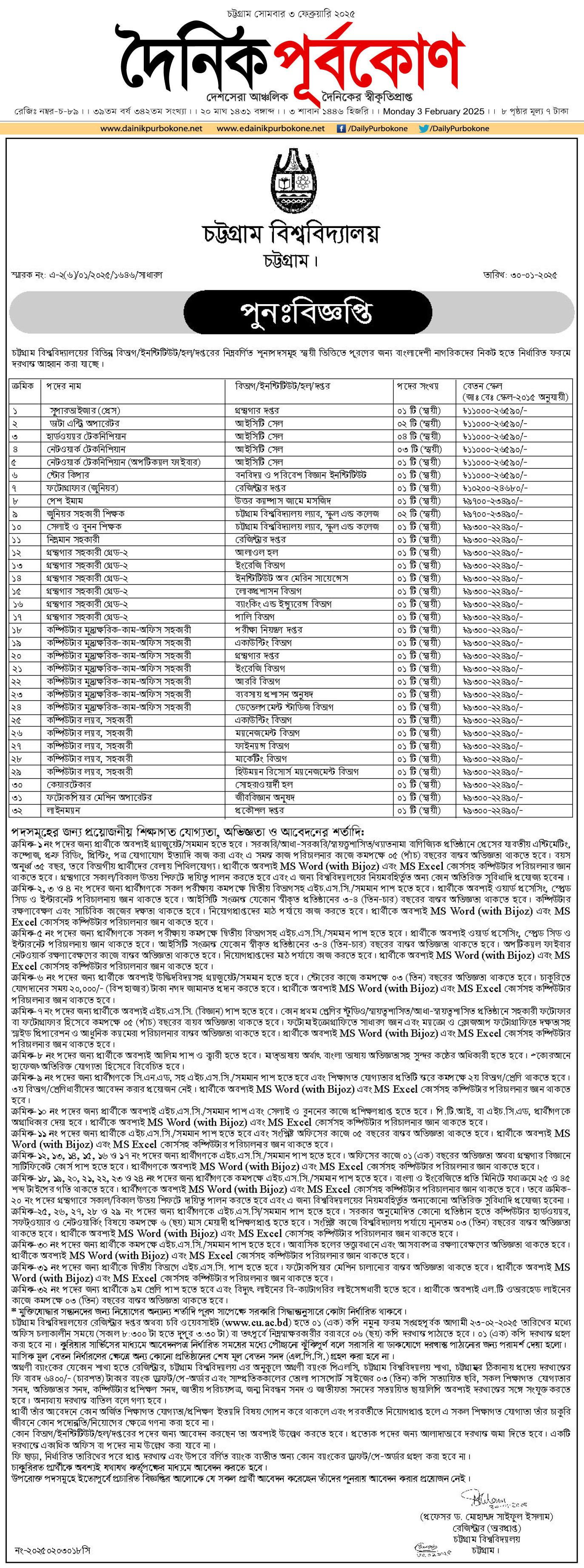 See/download Chittagong University Job Circular 2025, Job Apply Instructions, Job Application Form, Application Fee, Payment Process, Salary, Age, and Other Information from the images below: