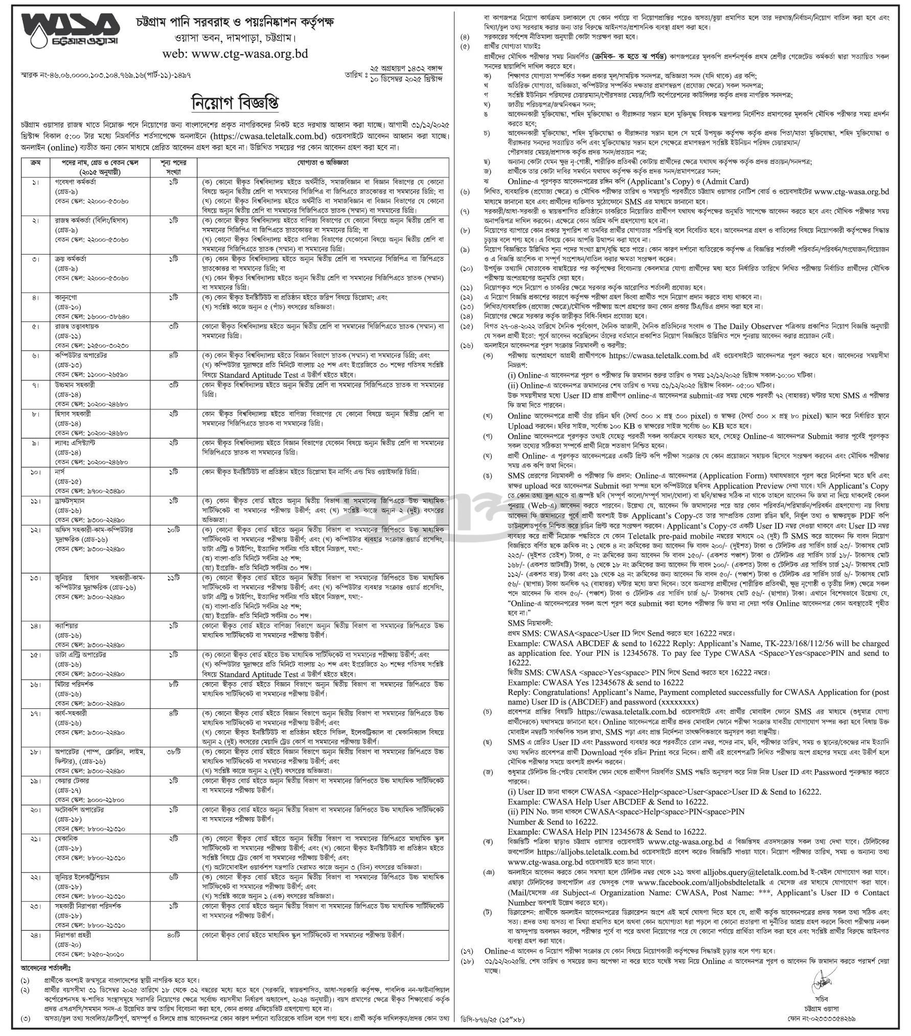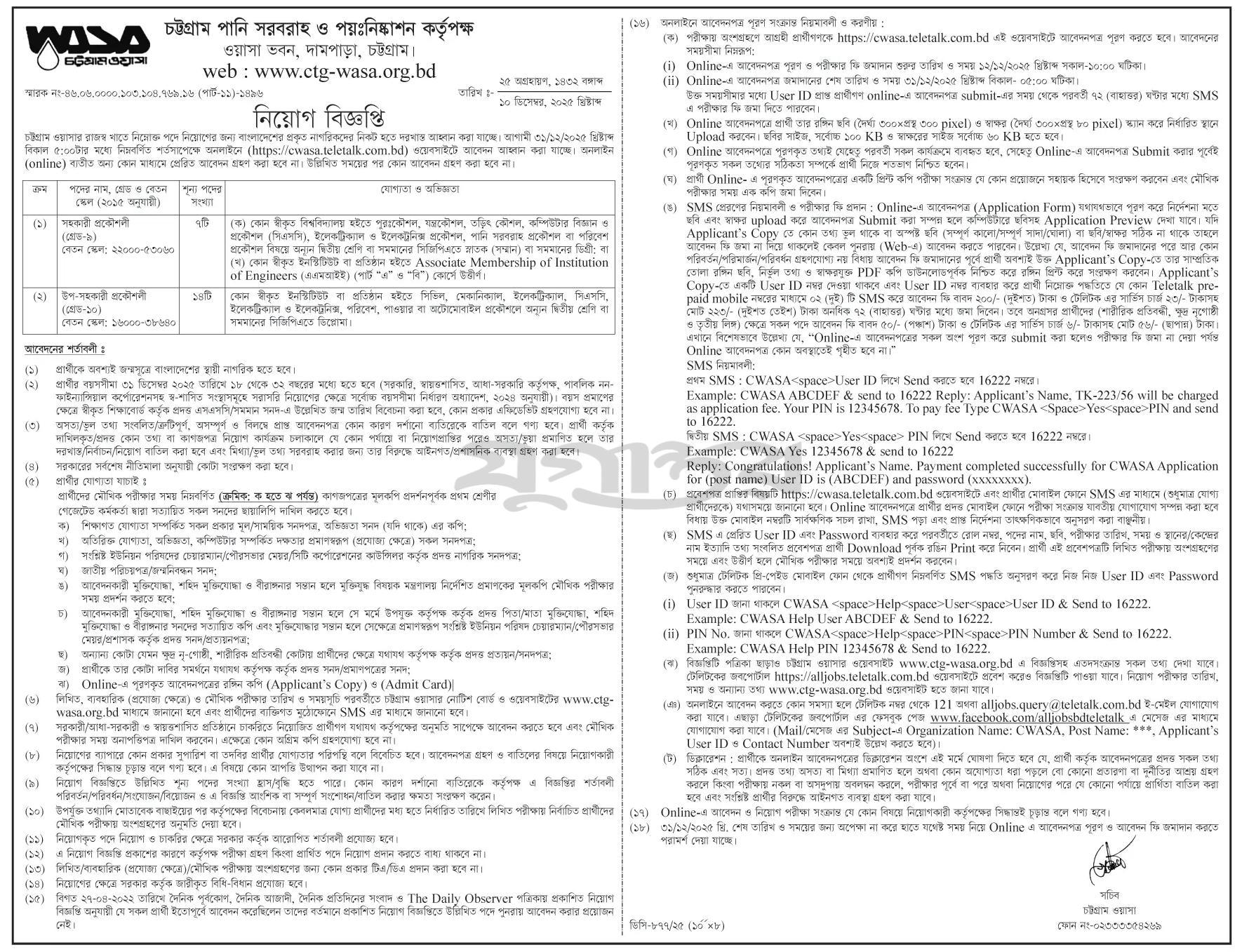 See/download the Chattogram Water Supply and Sewerage Authority Job Circular 2025, Job Apply Instructions, Job Application Form, Application Fee, Payment Process, Salary, Age, and Other Information from the images below: