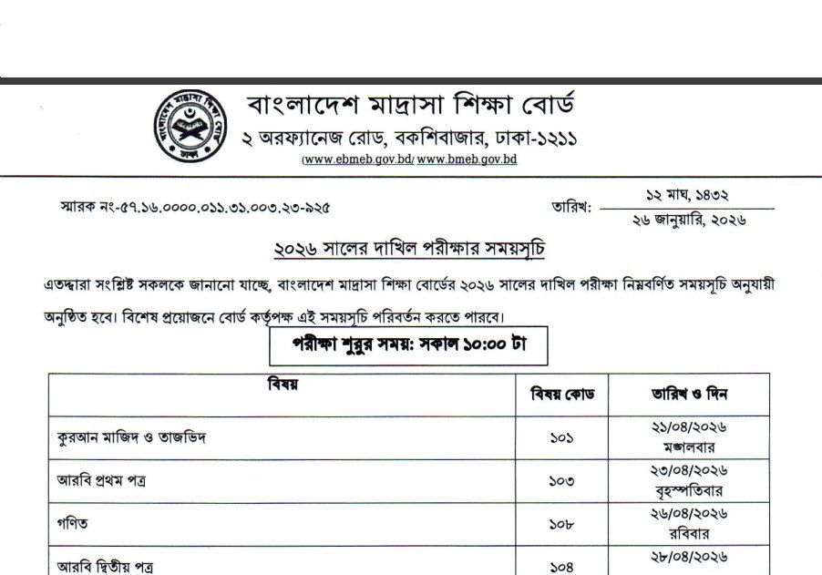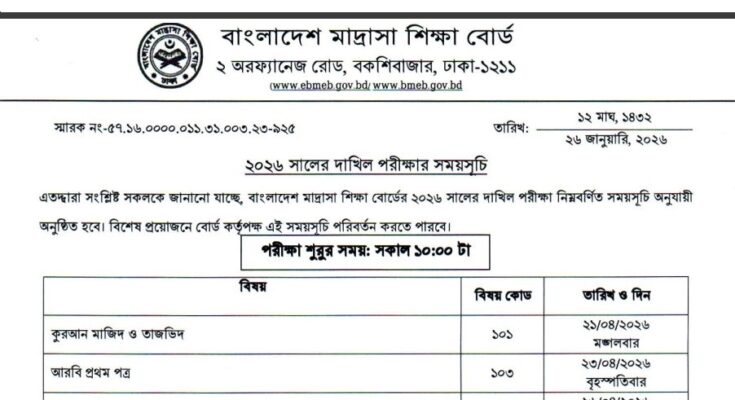 See/download Bangladesh Madrasah Education Board Dakhil Exam Routine 2026 from the images below:
