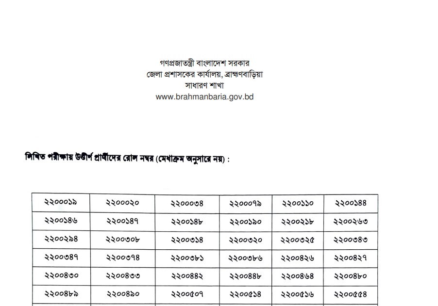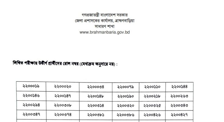DC Office Brahmanbaria Exam Result Notice 2025: